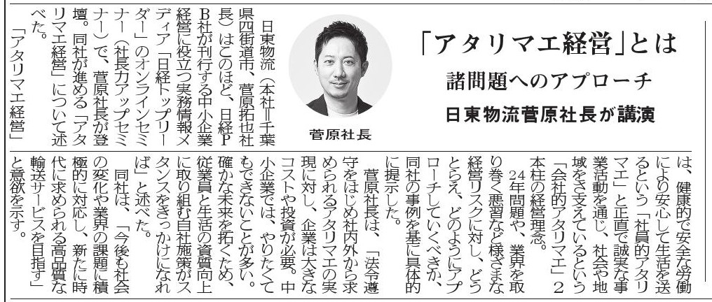 代表の菅原拓也が講師として登壇した、日経トップリーダーの”社長力アップセミナー” に関する記事が、「日本流通新聞」にて紹介されました。