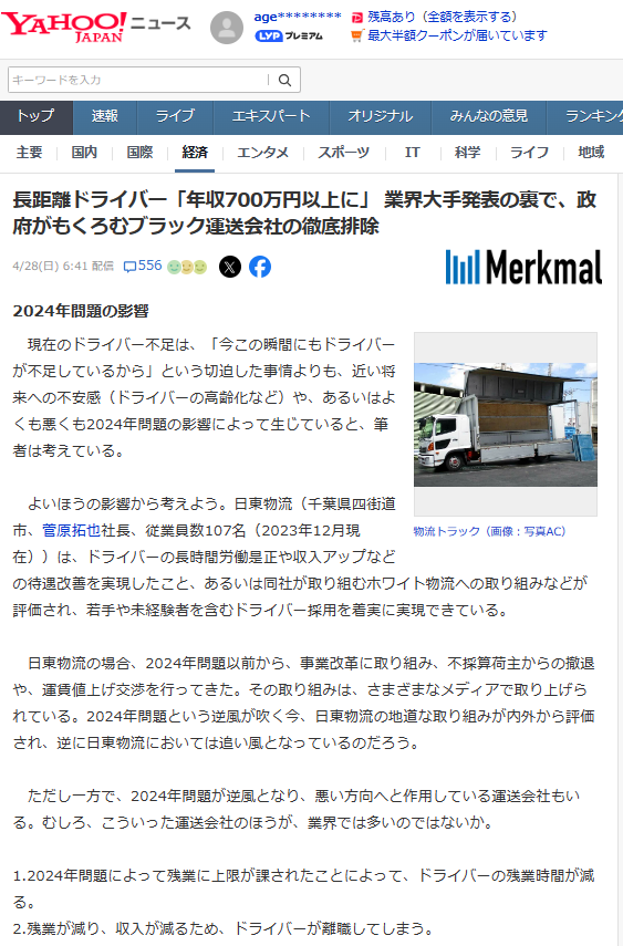 4/28に公開されたYahoo!ニュース『長時間ドライバー「年収700万円以上に」 業界大手発表の裏で、政府がもくろむブラック運送会社の徹底排除』において、当社がホワイト物流企業として紹介されました。