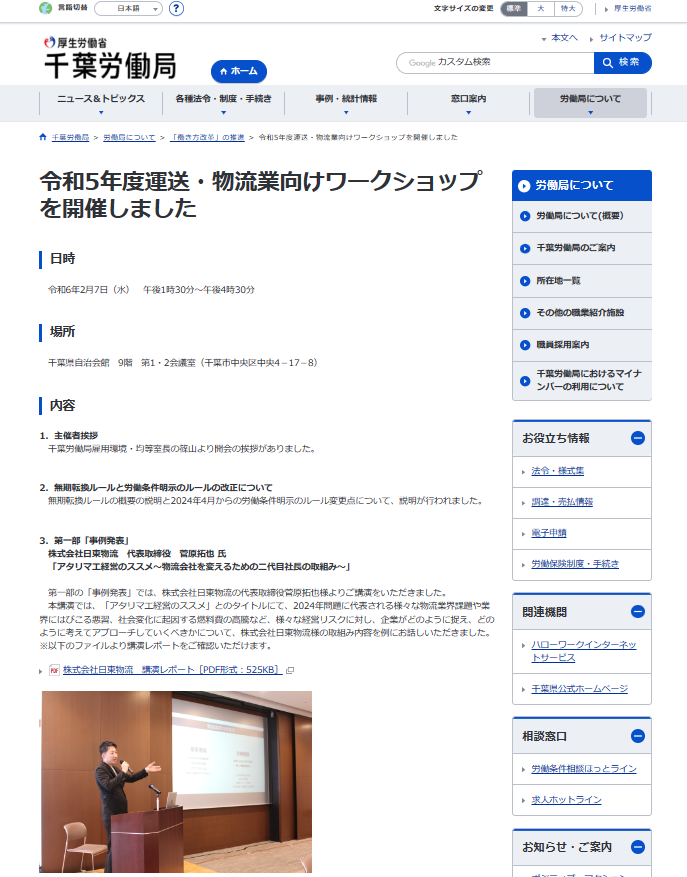 厚生労働省・千葉労働局が2月7日(水)に実施した運送・物流業向けワークショップにおける、当社代表の菅原拓也のセミナーの様子が、千葉労働局のホームページに掲載されました。