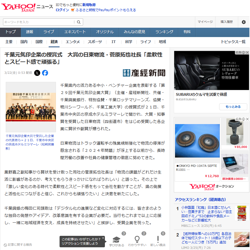 千葉元気印企業の授賞式 大賞の日東物流・菅原拓也社長「柔軟性とスピード感で頑張る」(産経新聞) – Yahoo!ニュース