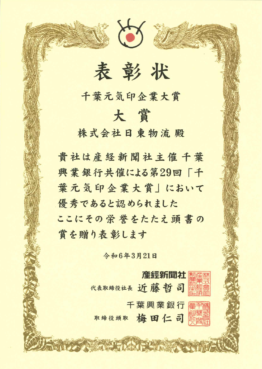 産経新聞社が主催する「第29回千葉元気印企業大賞」において当社が大賞(千葉県知事賞)を受賞、3月21日に京成ホテルミラマーレで行われた授賞式において、千葉県副知事より表彰されました。