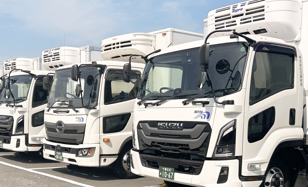 わたしたちは、2tから10tまでの冷凍・冷蔵車両を、常時80台前後保有して配送をおこなっています(すべてAT車)。さまざまな温度帯の商品を1車両に積み合わせた配送や、2層式(常温+冷蔵)・3層式(常温;冷蔵+冷凍)の配送にも対応、高品質な温度管理配送を得意とし、鮮度と品質を保った上質な配送サービスを提供しています。