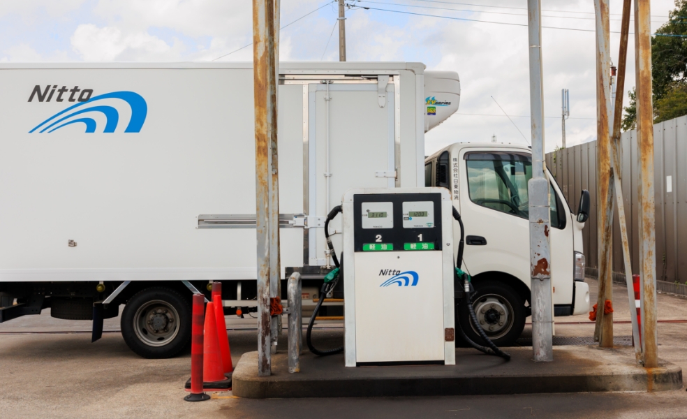 30,000ℓ容量の大型給油タンクを会社構内に設置、業務前後に給油しておくことで、業務中に給油の心配をすることも帰庫途中に給油スタンドに寄る必要もなくなるため、労働時間の短縮とストレスの軽減につながっています。また、災害や緊急時など給油が困難な場合にも対応ができるため、安定的な配送が可能です。
