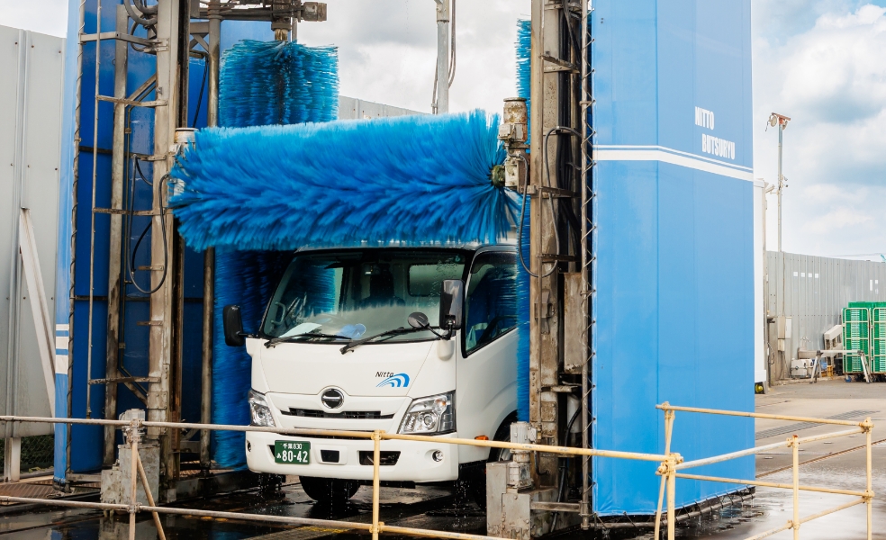 当社は、構内に大型自動洗車機を導入しており、手洗いだと1時間以上かかる洗車作業を5分程度で完了できるため、いつでも気持ちよく商品をお届けできるよう、定期的に洗車を行い車両美化に努めています。