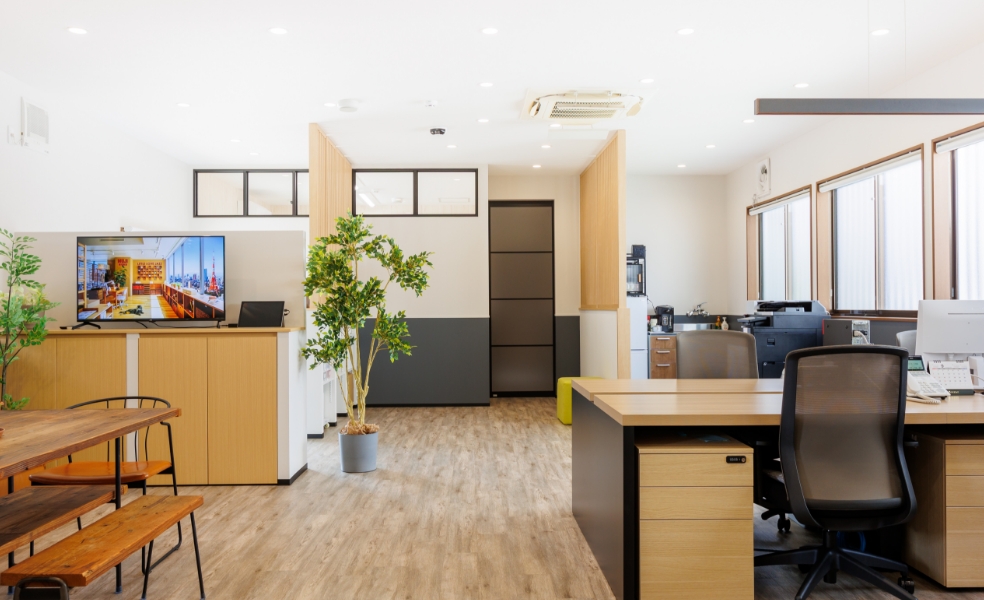 管理棟では、経理や総務、広報など、会社の様々な活動を円滑に進めるためのバックオフィス業務を行っています。外部のお客様をお迎えする応接スペースも完備しています。