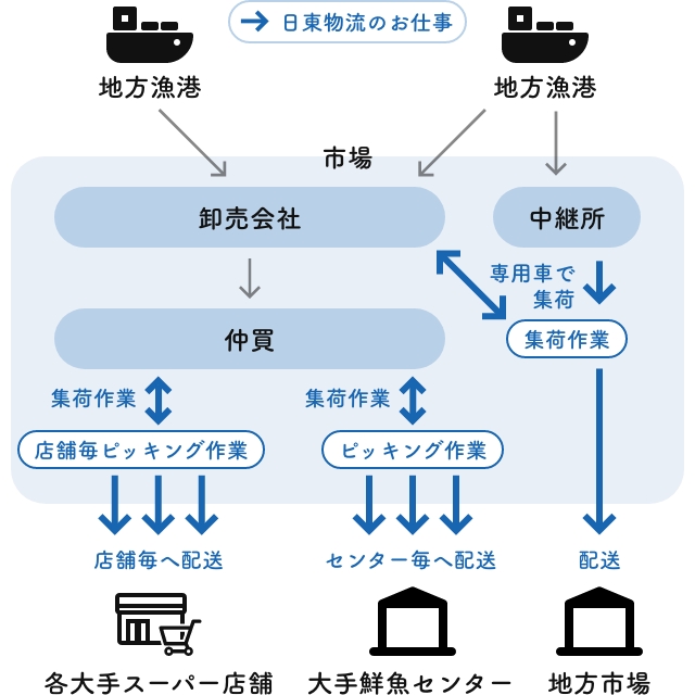 地方漁港で水揚げされた鮮魚は、まず市場の卸売会社に集約され、卸売会社から仲買が鮮魚を購入します。わたしたちは、取引先から依頼された商品を仲買や卸売会社からピッキングし、店舗やセンターに配送します。経験豊かな従業員が揃っているため、複雑な市場内のピッキングはもちろん、仕分けした後に配送することも可能です。鮮魚のほか、青果物・肉なども取り扱っています。
