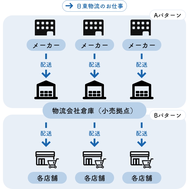 メーカーから消費者へ商品が届くまで、あらゆる部分で運送会社が必要になります。わたしたちの全配送の約6割は、主にメーカーから物流会社の倉庫へ、また倉庫から店舗への配送であり、例えばコーヒーショップでは店舗向け、コンビニ向け商品はコンビニのセンター向けというように、メーカー側の意向に合わせて配送を行います。