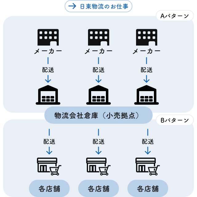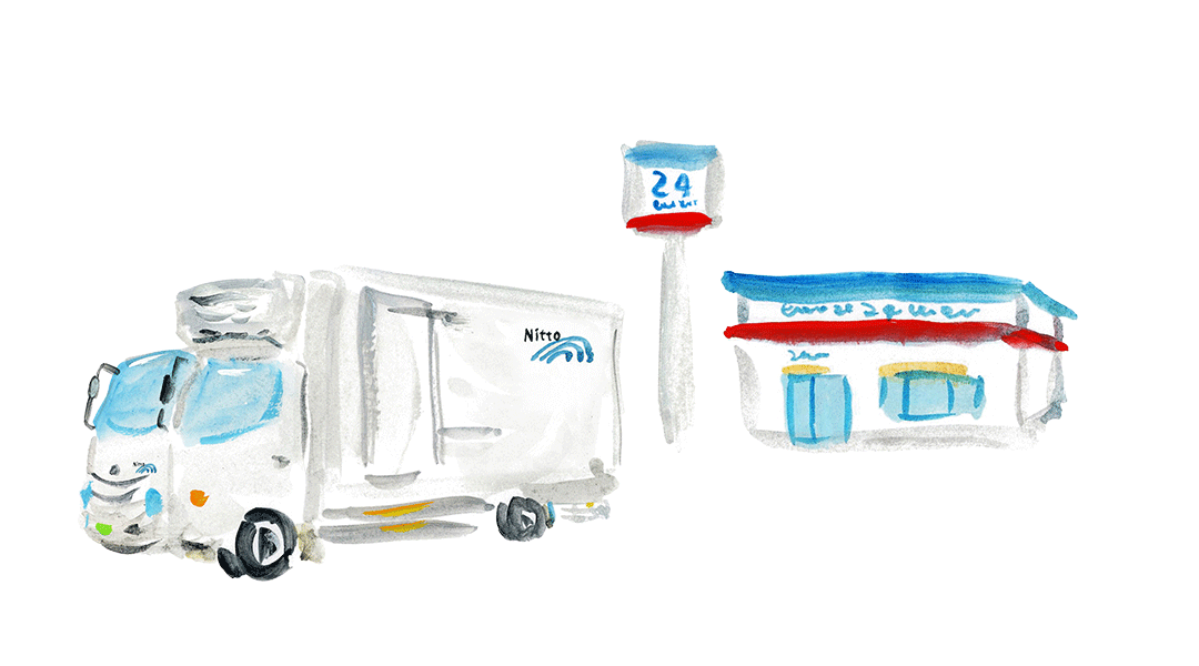 生産者(メーカー)から消費者へ商品が届くまで、あらゆる部分で運送会社が必要になります。わたしたちは、主にメーカーから物流会社の倉庫へ、またその倉庫から各店舗への配送を行っています。コーヒー専門ショップでは店舗向けの配送、コンビニ向けデザート商品は、メーカーからコンビニのセンターまでというように、生産者側の意向に合わせて配送を行います。わたしたちの全配送の6割程度が、これら生産者、物流会社倉庫、各店舗への配送になります。