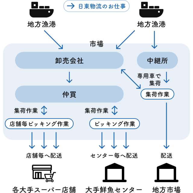 さまざまな地方漁港で水揚げされた鮮魚は、まず市場の卸売会社に集約されます。そして、仲買が卸売会社から鮮魚を購入します。わたしたちは、大手スーパーなど取引先から依頼された商品(鮮魚)を市場内の各仲買や卸売会社からピッキングし、店舗、もしくはセンターへと配送します。経験豊かな従業員が揃っているため、複雑な市場内のピッキングはもちろん、仕分けした後に配送することも可能です。鮮魚のほかに、青果物・肉なども取り扱っています。